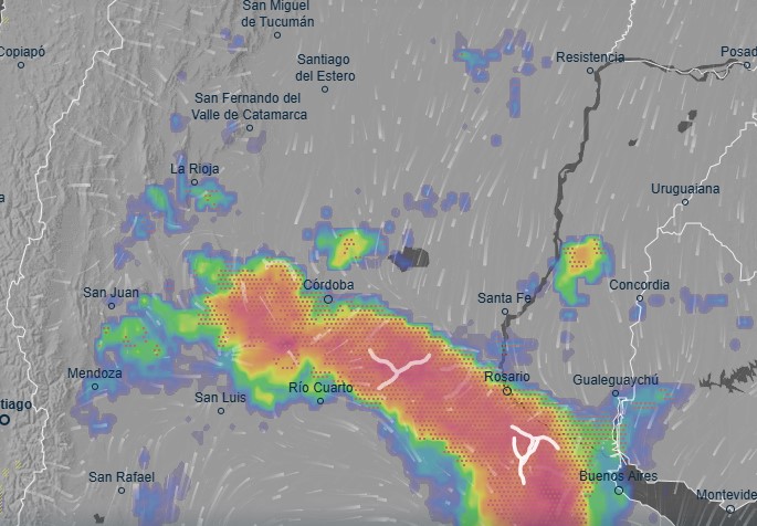 “El área será afectada por lluvias y tormentas de variada intensidad, algunas localmente fuertes. Las mismas podrán estar acompañadas por abundante caída de agua en cortos períodos, frecuente actividad eléctrica, granizo e intensas ráfagas que pueden alcanzar los 90 km/h”, indica el reporte oficial.