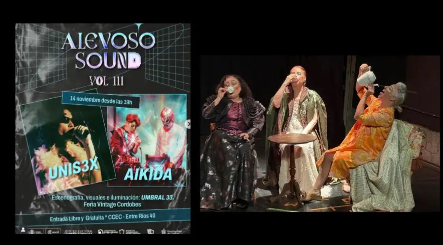 El viernes a las 19:00, el Centro Cultura España Córdoba (Entre Ríos 40) realizará una nueva edición de Alevoso Sound III: bandas emergentes, Djs y artistas visuales, junto a ferias independientes de vinilos, ropa vintage y emprendimientos locales. A las 20:00, el Teatro Comedia (Rivadavia 254) presenta “Fantasmáticas”, la historia de tres actrices que conviven en un teatro en ruinas e intentan volver a crear, enfrentando los prejuicios sobre la vejez.