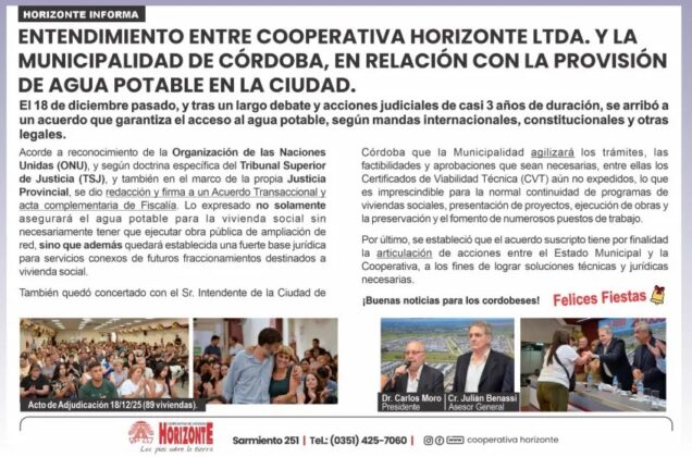 Acorde a reconocimiento de la Organización de las Naciones Unidas (ONU), y según doctrina específica del Tribunal Superior de Justicia (TSJ), y también en el marco de la propia Justicia Provincial, se dio redacción y firma a un Acuerdo Transaccional y acta complementaria de Fiscalía. Lo expresado no solamente asegurará el agua potable para la vivienda social sin necesariamente tener que ejecutar obra pública de ampliación de red, sino que además quedará establecida una fuerte base jurídica para servicios conexos de futuros fraccionamientos destinados a vivienda social.