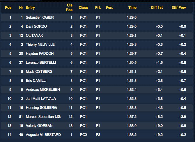 El tres veces campeón del mundo calcó el tiempo del español y por ello la victoria en el inicio del YPF Rally Argentina 2016 fue compartida. A solo 0s1 de los ganadores terminó el estonio Ott Tanak (Ford Fiesta RS). El belga Thierry Neuville (Hyundai i20 New Generation) y el neozelandés Haydden Paddon (Hyundai i20 New Generation) completaron el top 5.
