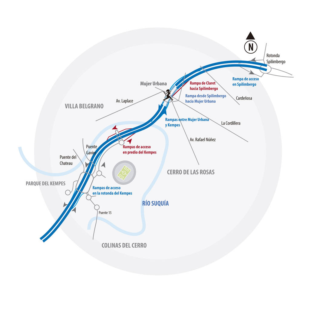 • En el sentido contrario de circulación -es decir El Tropezón – Spilimbergo- las ramas de acceso a la avenida serán la proveniente desde Av. Colón (subida provisoria) y en la rotonda frente al Kempes. Para las salidas, se podrán utilizar la de rotonda Kempes, la Avenida Núñez frente a Mujer Urbana y la ubicada en el distribuidor Spilimbergo.