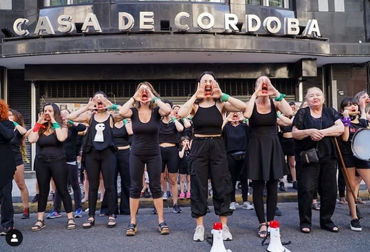 Vestidas de negro, con un pañuelo verde atado en el puño y una cruz de labial rojo sellando sus labios, un centenar de mujeres encabezado por la actriz Thelma Fardín ocupó la vereda de la Casa de Córdoba en Callao al 300 y realizó una coreografía exigiendo la libertad de Flavia Saganías.