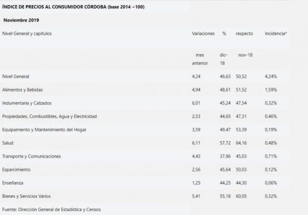 Este jueves la Dirección General de Estadística y Censos informó que el Índice de Precios al Consumidor Córdoba durante el mes de noviembre sufrió un incremento del 4,24 por ciento. En lo que va del año la inflación ya es del 46,63%, mientras que si se toma noviembre de 2018 este indicador es del 50,52%.