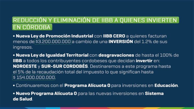 Entre las nuevas leyes, se destaca la Ley de Promoción Industrial, que establece Ingresos Brutos cero para empresas con facturación menor a $3.200 millones que inviertan al menos el 1,2% de sus ingresos. A su vez, la Ley de Igualdad Territorial ofrecerá desgravaciones de hasta el 100% a quienes inviertan en el noroeste y sur provincial, con una asignación de hasta $154.000 millones del total de la recaudación.