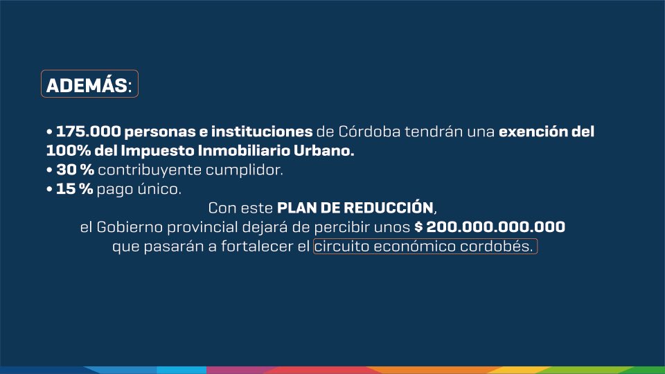 Entre las principales medidas se destaca la reducción de alícuotas del Impuesto a los Ingresos Brutos, que beneficiará a más del 60% de los comerciantes cordobeses. Según el detalle oficial, la tasa bajará del 3,5% al 2,5%, lo que representa una reducción del 30%. En total, el Gobierno provincial dejará de percibir $450.000 millones, que —según Llaryora— “pasarán a dinamizar la economía cordobesa”.