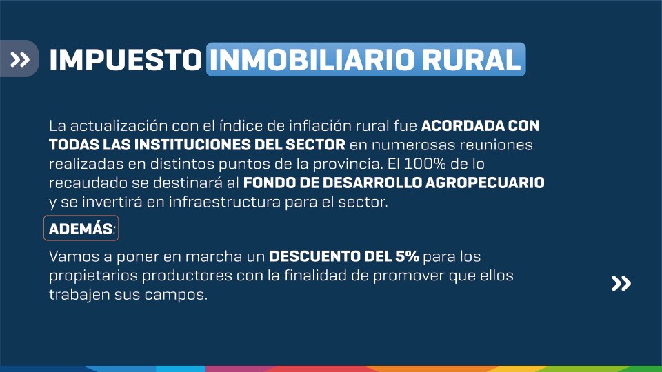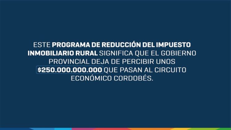También se implementará una actualización del Impuesto Inmobiliario Rural acordada con las instituciones del sector, con un descuento del 5% para los propietarios que trabajen sus campos. El 100% de lo recaudado se destinará al Fondo de Desarrollo Agropecuario, orientado a infraestructura y mejoras productivas. Este esquema significará $250.000 millones menos de recaudación para la Provincia, fondos que —afirmó el mandatario— “quedarán en el circuito económico cordobés”.
