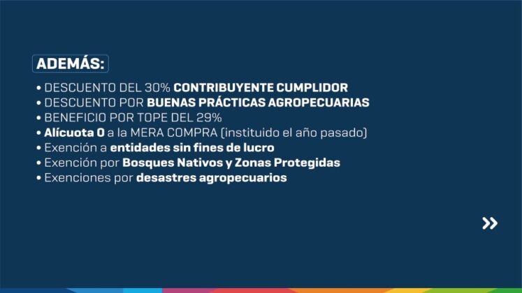 También continuarán los programas de Alícuota Cero para inversiones en educación y salud, y habrá nuevas exenciones para 175.000 personas e instituciones que quedarán exceptuadas del Impuesto Inmobiliario Urbano.