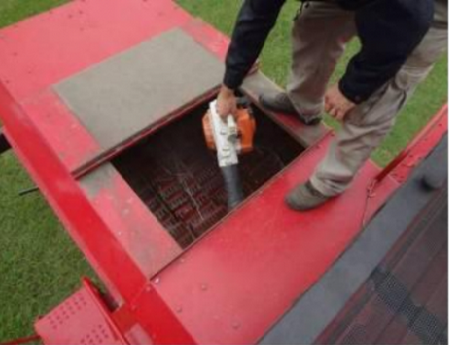 1) Al finalizar la cosecha en uno de los lotes productivos, el encargado de la tarea y de la máquina deberá realizar la limpieza general de la herramienta tratando de lograr que el flujo de aire llegue de la sopladora a todos los órganos de la cosechadora. Esta limpieza debe realizarse fuera del lote productivo y en un lugar de trabajo donde estas semillas no puedan germinar y generar un problema. El lugar adecuado es el patio de una casa de campo donde luego se pueda juntar y destruir esas simientes.