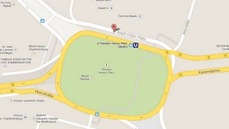 El verdadero nombre de la plaza es Theodor Heuss, por el primer presidente de la República Federal de Alemania, pero durante la época nazi (1933-1945) fue conocida por el nombre de Hitler (antes de 1933, se llamaba Reichskanzlerplatz o Plaza del Canciller del Reich).
