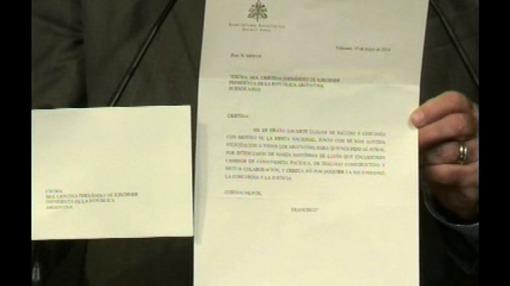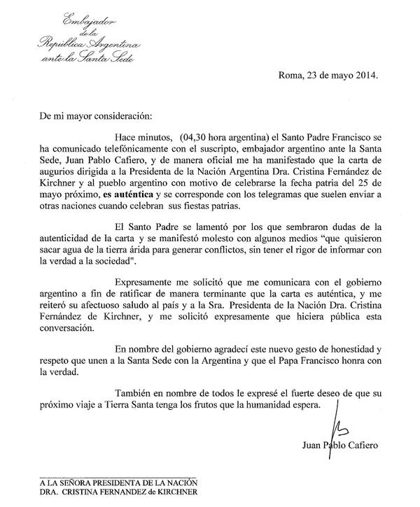 El cura, que ayer había negado la autenticidad de la misiva diciendo que todo era “de muy mala leche”, sostuvo que “es del Vaticano, claro, de la Santa Sede”, y precisó que “no se trata de una carta”, sino “de un telegrama de forma que se le manda a los distintos gobiernos cuando hay fechas patrias”.