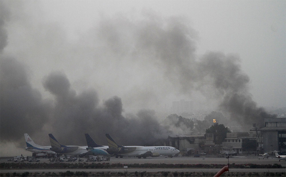 Akhtar señaló que los extremistas, que llevaban chalecos explosivos e iban vestidos como policías, entraron en el aeropuerto en dos grupos de cinco e incendiaron una terminal de carga. Siete de ellos murieron en el tiroteo y tres se volaron con cargas explosivas al verse rodeados por soldados.