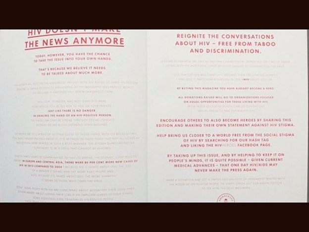 “Si esta revista se mantiene en sus manos es como sostener a alguien que es VIH positivo. Nada puede suceder, nada puede dañarte la celebración de la revista, y nada puede dañarte la celebración de una persona VIH-positivo”, dijo.