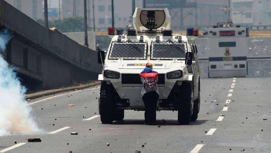 Humo. La policía, en un vehículo blindado, dispersa a los manifestantes en Caracas, este jueves. /AFP