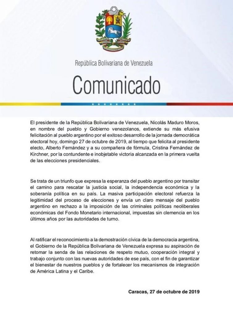 “¡Felicitaciones al heroico pueblo argentino! En un ejercicio histórico democrático, han derrotado al neoliberalismo del FMI. La contundente victoria de Alberto Fernández y Cristina Fernández de Kirchner abre el horizonte de esperanza hacia un futuro mejor para la Argentina. ¡Un Abrazo Alberto y Cristina!”, publicó el líder chavista en su cuenta de Twitter.
