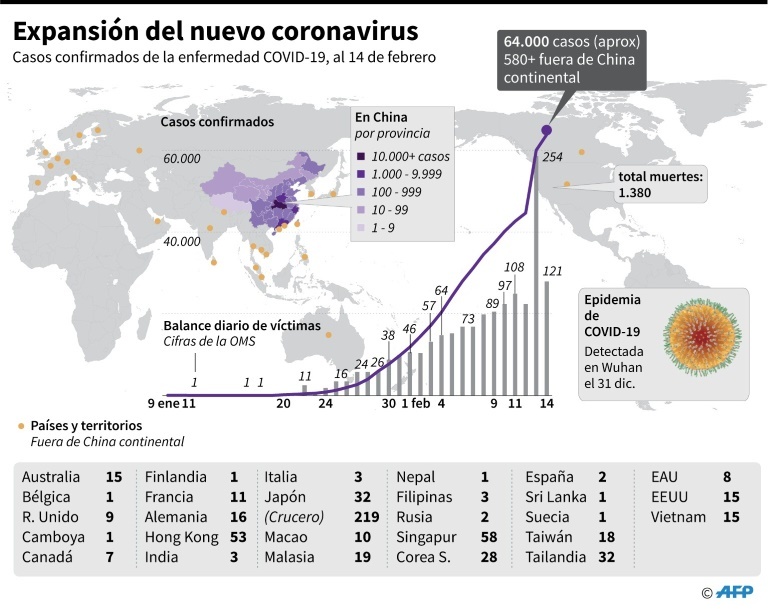 El principal foco de infección fuera de China es el crucero de lujo “Diamond Princess”, que continúa en cuarentena frente a las costas de Japón en el puerto de Yokohama, con 218 casos.