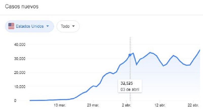 Según información de la Universidad de Johns Hopkins, Estados Unidos registró, desde el inicio de la pandemia, un total de 900.000 casos y más de 53.000 fallecidos, marcando con estas cifras el brote de Covid-19 más mortal de todo el mundo.