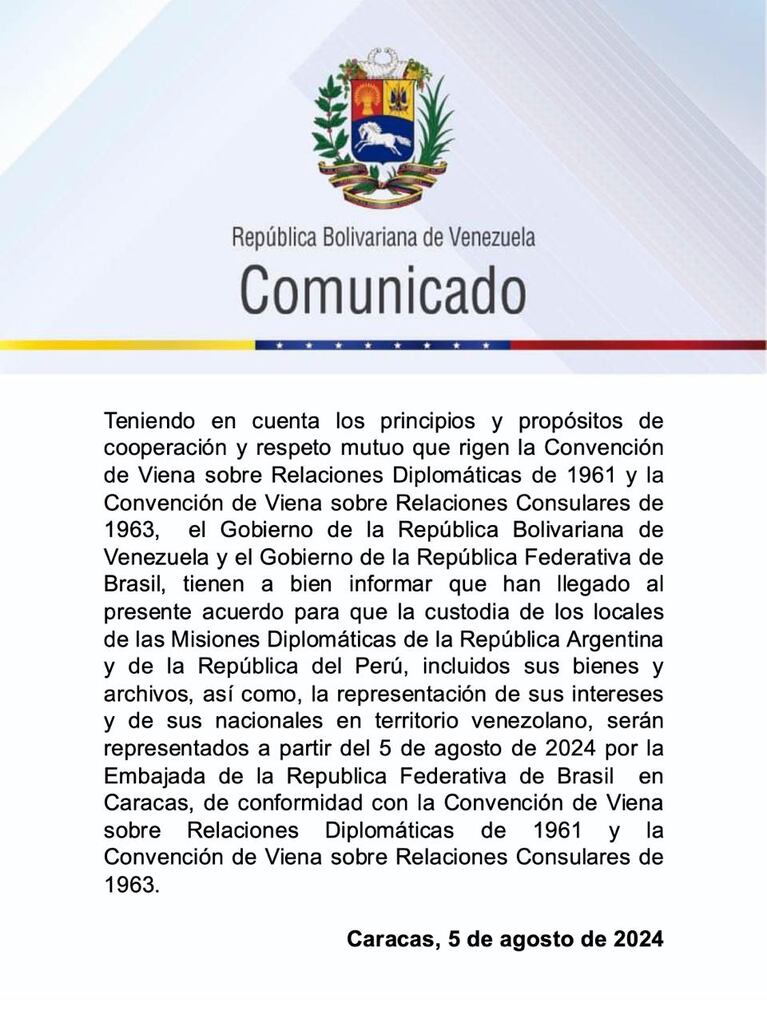 Esta decisión fue informada mediante un mensaje en redes sociales, donde se especifica que, a partir del 5 de agosto de 2024, la Embajada de la República Federativa de Brasil en Caracas se encargará de la custodia de los locales, bienes y archivos de las misiones diplomáticas de Argentina y Perú.