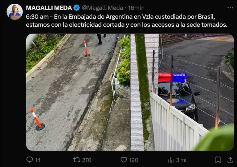 A través de su cuenta de X (ex Twitter), Pedro Urruchurtu, otro de los asilados y coordinador internacional del partido Vente Venezuela, alertó sobre la presencia de las fuerzas de seguridad: “Patrullas del SEBIN y del DAET, junto a funcionarios encapuchados y armados, rodean y asedian la Residencia de Argentina en Caracas”, publicó, acompañado de videos que muestran a las patrullas rodeando el edificio.