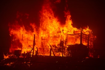 Una residencia en llamas mientras un bombero combate un incendio en Pacific Palisades, el martes 7 de enero de 2025, en Los Ángeles. (AP/Eugene Garcia)