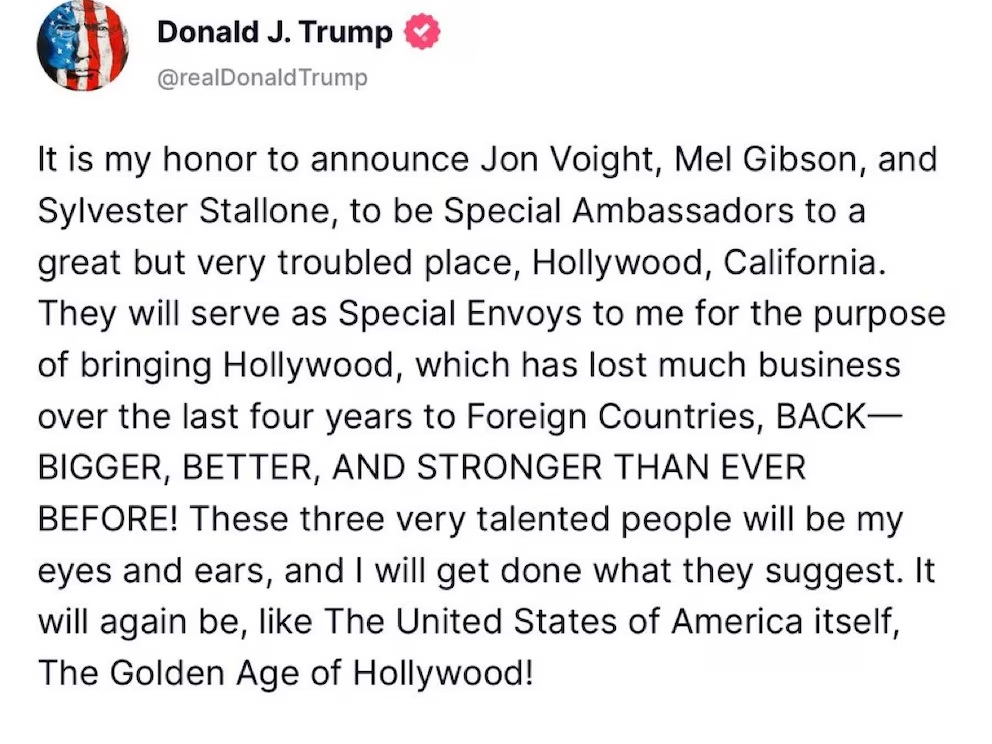 Donald Trump, con esta iniciativa, persigue objetivos económicos como que la industria del cine estadounidense recupere y gane mercados en el mundo: “Servirán como enviados especiales para mí con el objetivo de traer Hollywood– que ha perdido muchos negocios en los últimos cuatro años frente a países extranjeros, de vuelta—más grande, mejor y más fuerte que nunca“, aseguró en su mensaje.