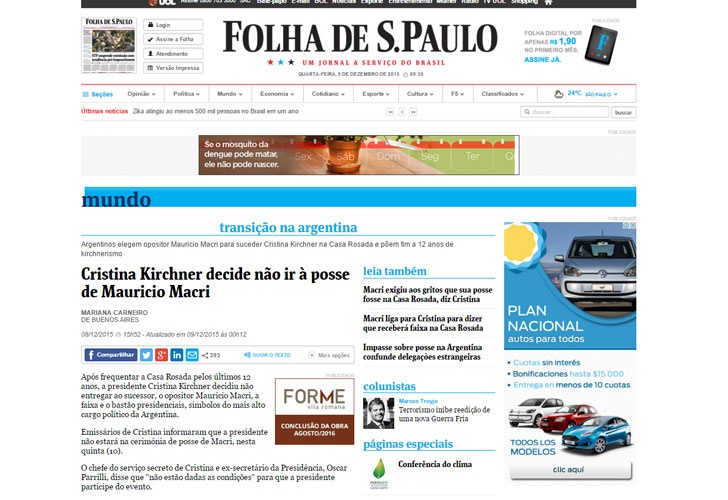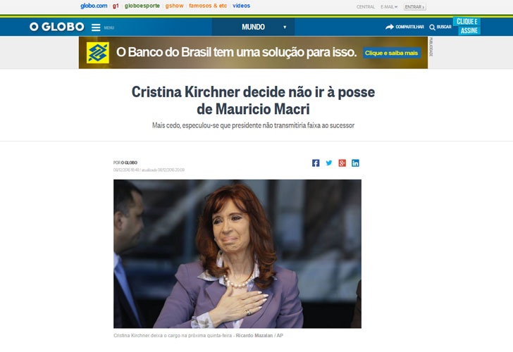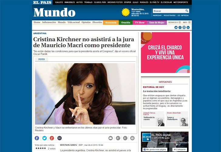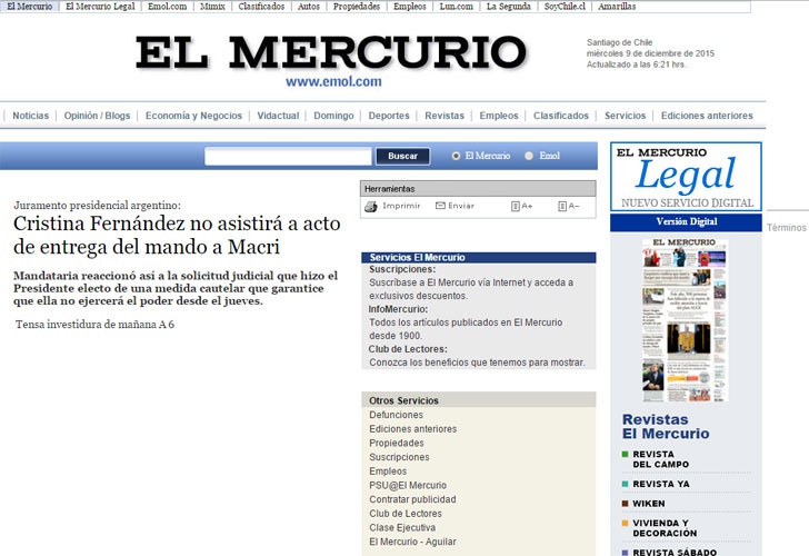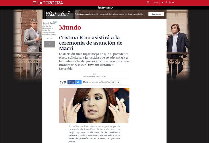 En Chile destacaron que la decisión de Cristina se debió a la medida cautelar interpuesta desde el macrismo. El Mercurio explicó: “Mandataria reaccionó así (no asistir a la jura) a la solicitud judicial que hizo el Presidente electo de una medida cautelar que garantice que ella no ejercerá el poder desde el jueves”.