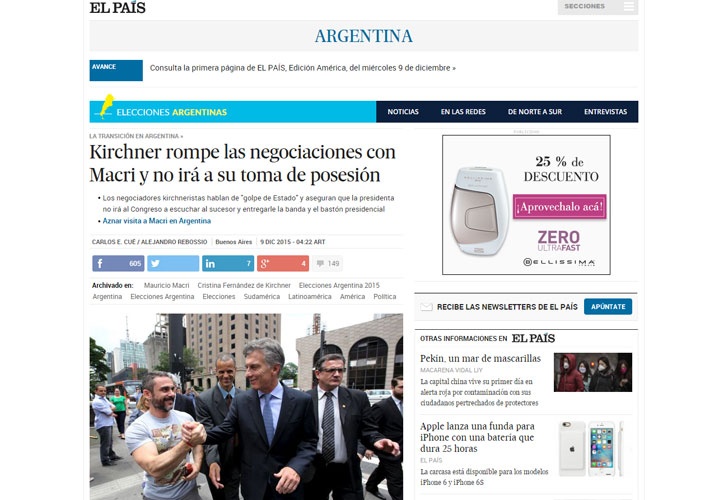El País de España tituló: “Kirchner rompe las negociaciones con Macri y no irá a su toma de posesión”, y especificó que “los negociadores kirchneristas hablan de “golpe de Estado”. Además calificaron la entrega de los atributos de Cristina a Macri como “la foto más esperada por muchos argentinos”.