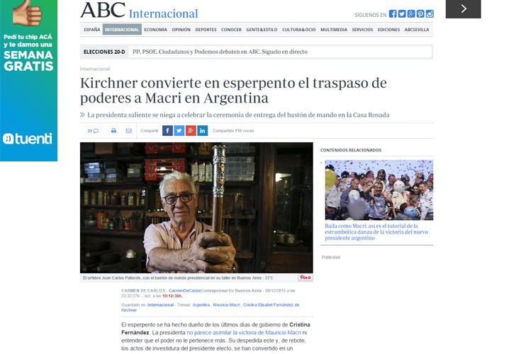 El diario español ABC fue uno de los más lapidarios con la mandataria al titular: “Kirchner convierte en esperpento el traspaso de poderes a Macri en Argentina”. En la nota, el medio consignó: “El esperpento se ha hecho dueño de los últimos días de gobierno de Cristina Fernández. La presidenta no parece asimilar la victoria de Mauricio Macri ni entender que el poder no le pertenece más. Su despedida este y, de rebote, los actos de investidura del presidente electo, se han convertido en un escándalo de proporciones nacionales e internacionales”. Asimismo, precisó que la actitud de la mandataria es “algo parecido a un ataque de furia”.