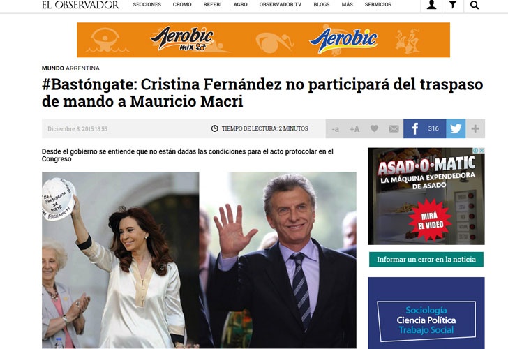 El Observador de Uruguay calificó de “bastóngate” la situación vivida en la Argentina. El Subrayado indicó que “se complicó: Cristina no va al Congreso para el traspaso de mando a Macri”. Finalmente, El País tituló: “Cristina Kirchner no asistirá a la jura de Mauricio Macri como presidente”.