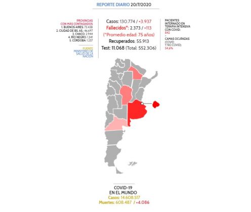 Unas 113 personas murieron este lunes en Argentina a causa del virus. La cifra más alta en un día. También 3.937 fueron diagnosticadas contagiadas en las últimas 24 horas, con lo que ascienden a 2.373 los fallecidos y a 130.774 los contagiados desde el inicio de la pandemia, informó este lunes el Ministerio de Salud.