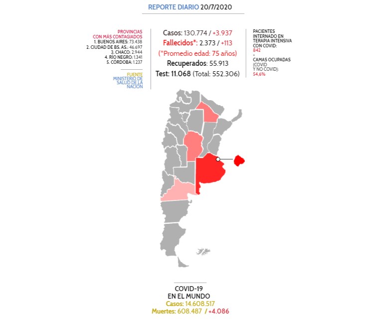 El total de acumulados por distrito indica que la provincia de Buenos Aires suma 73.340 casos; la Ciudad de Buenos Aires, 46.706; Catamarca, 58; Chaco, 2.996; Chubut, 242; Córdoba, 1.319; Corrientes, 129; Entre Ríos, 649; Formosa, 75; Jujuy, 764 y La Pampa, 8.