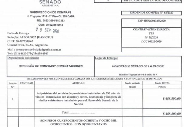Es el caso de la reciente contratación para instalar 250 mts. de vinilos esmerilados con diseños, usados en los vidrios y superficies – un material translúcido, no saca la luz y «da intimidad en el interior de los espacios» -. Se le pagó a la compañía Ciudad Gráfica para esta tarea $488.800.
