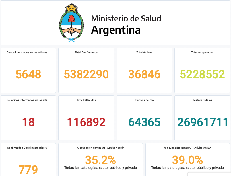 Por su parte la ocupación de camas de Unidad de Terapia Intensiva (UTI) está en 35,2% a nivel nacional, mientras que en el AMBA el número es de 39%. En estos momentos hay 779 personas internadas en UTI. Según informó el Ministerio, se realizaron 64.365 testeos en las últimas 24 horas (8,7% de positividad).