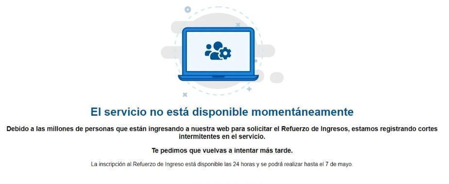 La inestabilidad cibernética en la red muestra diferentes carteles que advierten a cada usuario que deberá armarse de paciencia si quiere lograr postularse para el cobro del Refuerzo de Ingresos.