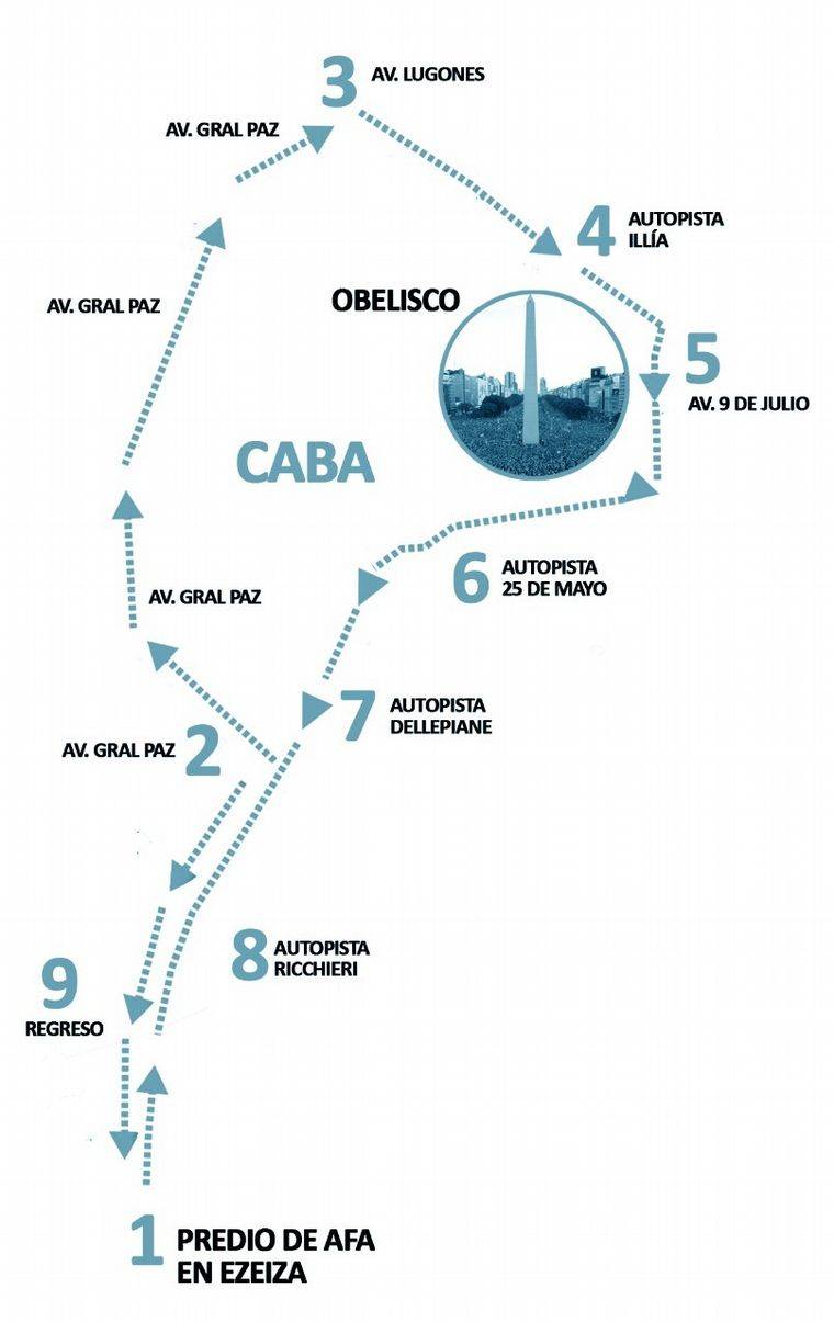 El paso por las avenidas se definió entre AFA y el Gobierno porteño de la siguiente manera: Ezeiza – Au. Ricchieri – Dellepiane – Au.25 de Mayo – Av. 9 de Julio – Libertador – Figueroa Alcorta – Libertador- Gral Paz – Ricchieri – Ezeiza.