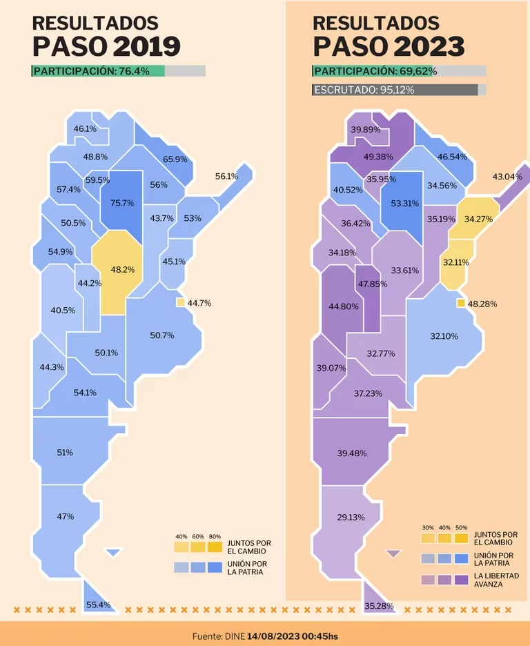 El kirchnerismo es uno de los grandes derrotados de estas PASO. Sergio Massa fue el segundo candidato más votado, pero Unión por la Patria quedó como la tercera fuerza a nivel nacional con el 27,16%. Si estos resultados se repitieran en las elecciones generales de octubre, el kirchnerismo podría no ingresar a una posible segunda vuelta para definir quién será el próximo presidente. Las caras largas en el búnker de Unión por la Patria traían preocupación porque sólo contaban triunfos en Chaco, Formosa, Catamarca y Santiago del Estero. La buena noticia para el kirchnerismo es que pudo retener la provincia de Buenos Aires: ganó con el 32,11% de los votos, tres de ventaja sobre Juntos.