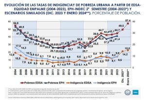 El estudio revela un preocupante aumento de la pobreza en el país, alcanzando un 57,4% en enero de 2024, el nivel más alto en las últimas dos décadas. El estudio atribuye este incremento a la devaluación de diciembre y al aumento en los valores de la canasta básica alimentaria y total.
