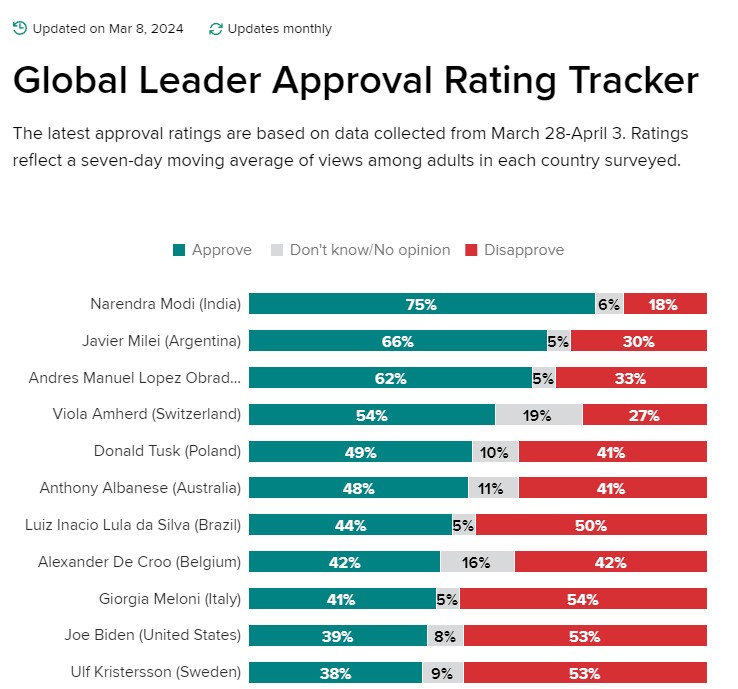 El informe titulado “Índice de aprobación de los líderes del mundo” incluyó a otros destacados referentes globales como Joe Biden de Estados Unidos, Giorgia Meloni de Italia y Pedro Sánchez de España.