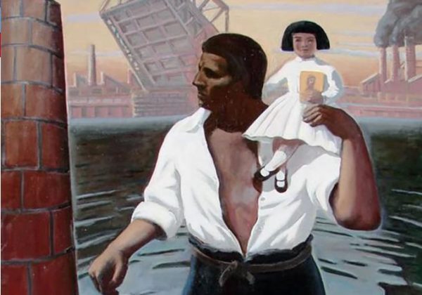 3) OLEO SOBRE TELA, AUTOR DANIEL SANTORO, TITULO EL DESCAMISADO GIGANTE AYUDA A LA MAMA DE JUANITO LAGUNA EN EL CRUCE DEL RIACHUELO, FIRMADO EN LATERAL IZQUIERDO.