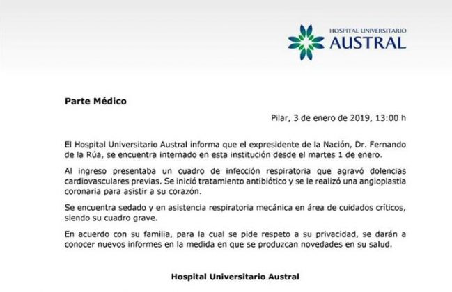 El ex presidente Fernando de la Rúa permanece internado en el Hospital Universitario Austral con un “cuadro grave”, sedado y con asistencia respiratoria mecánica en el área de cuidados críticos, según informó el establecimiento médico a través de un comunicado de prensa difundido durante el mediodía.