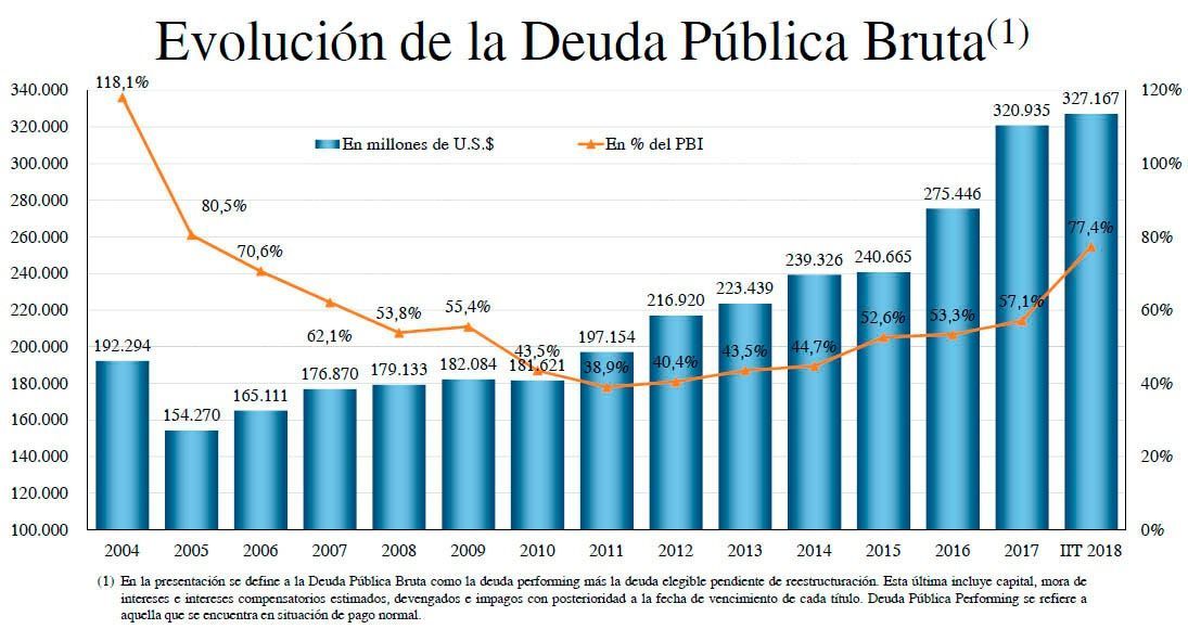 Tampoco acompañó en los cuadros estadísticos la proporción en términos de PBI de los u$s 337.267 millones en términos brutos, y u$s 334.800 millones netos de la pendiente de reestructuración con bonistas que no aceptaron los canjes de 2005, ni de 2016 ni el acuerdo final de 2016, que suman unos u$s2.456 millones.