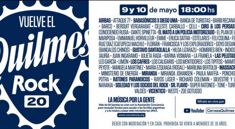 En este caso, será una versión por streaming que se podrá seguir por el canal de YouTube de Quilmes y solidaria, ya que se juntarán donaciones para proveer comida, artículos de limpieza y material educativo a través de Asociación Conciencia a la población más necesitada, así como también para el staff técnico de las bandas, ya que todos los trabajadores de sonido, iluminación, producción y escenario han sido uno de los sectores más golpeados por el parate.