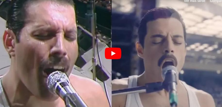 Un video subido por un usuario a YouTube compara la secuencia del festival Live Aid real de 1985 en que Queen volvió a las tablas luego de su separación con la escena equivalente de Bohemian Rhapsody: la historia de Freddie Mercury, el filme de Bryan Singer que recrea la historia del cantante junto a la banda inglesa.