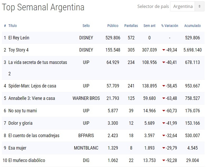 El podio se configuró de manera diferente en nuestro país, aunque el primer puesto también fue para Simba y compañía. La cuarta parte de Toy Story Quedó en segundo lugar y La vida secreta de tus mascotas 2, en tercero.