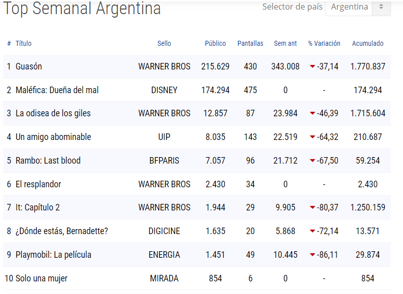 En Argentina en tanto, Maléfica no pudo con Joker. La película del villano de Batman continúa en el primer puesto del ranking y se aproxima a los dos millones de espectadores. La película protagonizada por Angelina Jolie sumó desde su estreno cerca de 175 mil tickets cortados. El podio lo completa La Odisea de los giles, el gran fenómeno del año en materia de cine nacional.