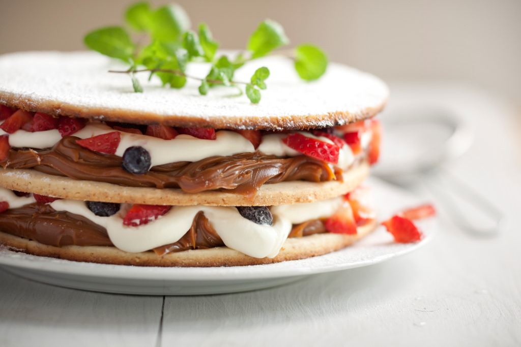 - Untar dos de los discos con dulce de leche y luego con crema. Sobre la crema disponer los frutos rojos. Encimar los discos y cubrir con el tercer disco.