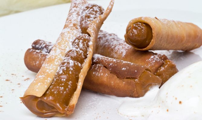 - Estira la masa con un rodillo y haz rollitos con la ayuda de moldes cilíndricos. Fríe las cañas en una sartén con abundante aceite a temperatura media y retira los moldes. Introduce la leche condensada en una manga pastelera y rellena las cañas con esta pasta.