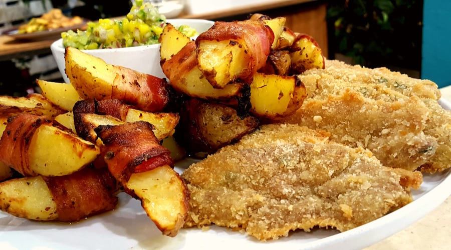 - Pintar con mostaza, pasar por el batido de huevos sal, pimienta, perejil y tomillo picados. Pasar por pan rallado y freír en aceite caliente.
