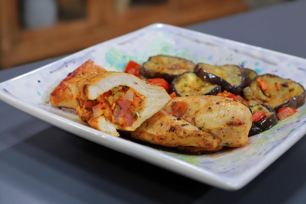 - Cortar las pechugas rellenas en rodajas gruesas y acompañar con las berenjenas grilladas con los vegetales.