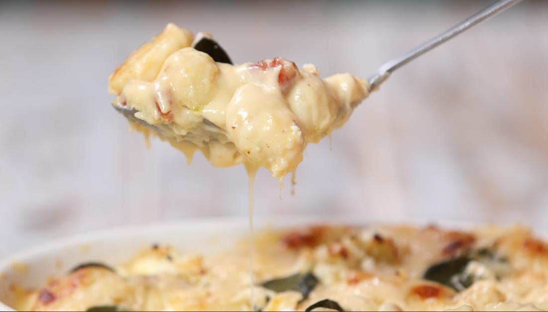 - Agregar los ñoquis y panceta y pasar a una fuente para para horno. Cubrir con el queso parmesano y agregar la ricota y las hojas de savia.