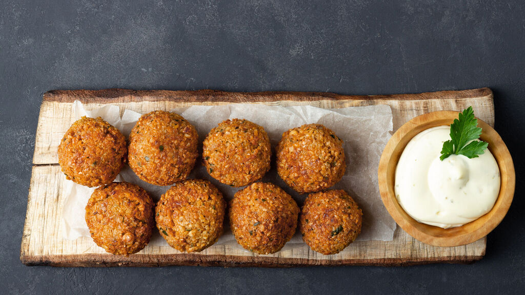 - Triturar directamente los garbanzos «sin cocer» o habas con la batidora o picadora junto con las cebollas, los ajos, el perejil, el cilantro fresco y una taza de agua. Mezcle hasta conseguir una textura espesa.